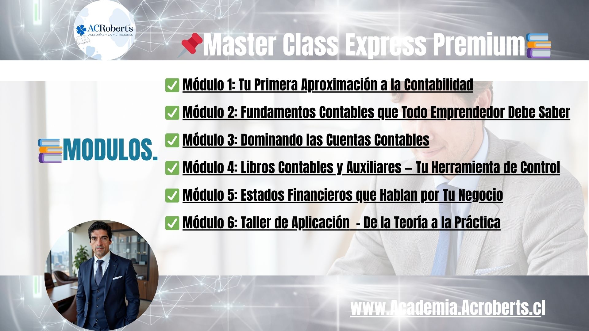 Este curso está diseñado para entregar a emprendedores, estudiantes y profesionales en formación una comprensión clara, práctica y completa de la contabilidad desde cero, con enfoque en la confección de libros contables, auxiliares y estados financieros, bajo normas básicas IFRS.